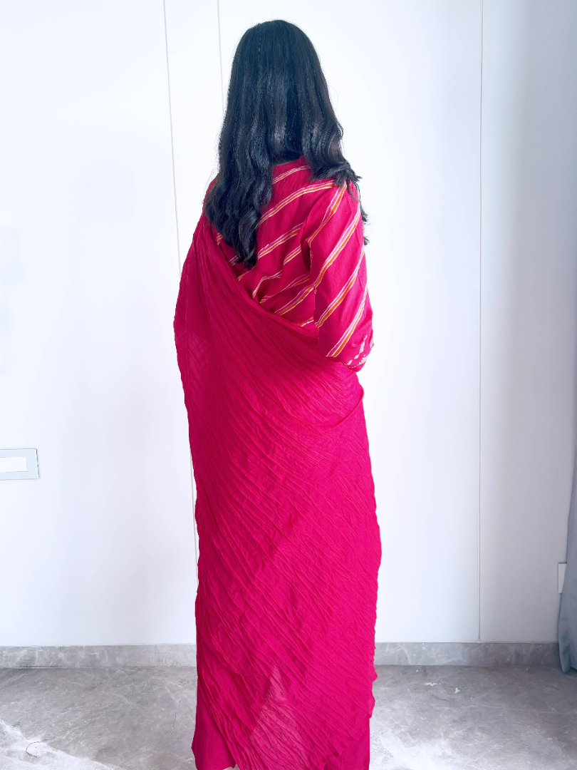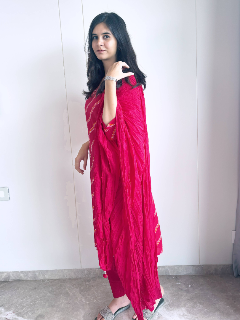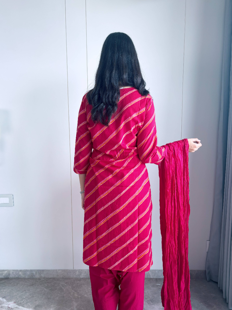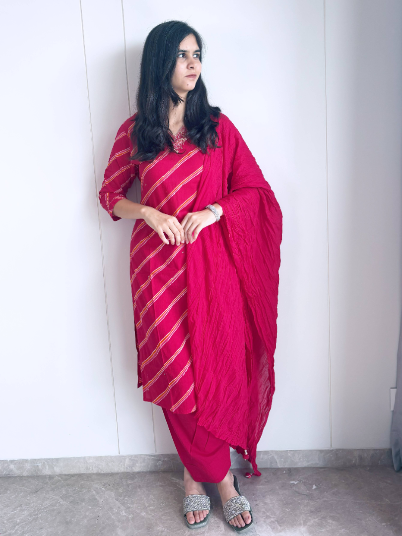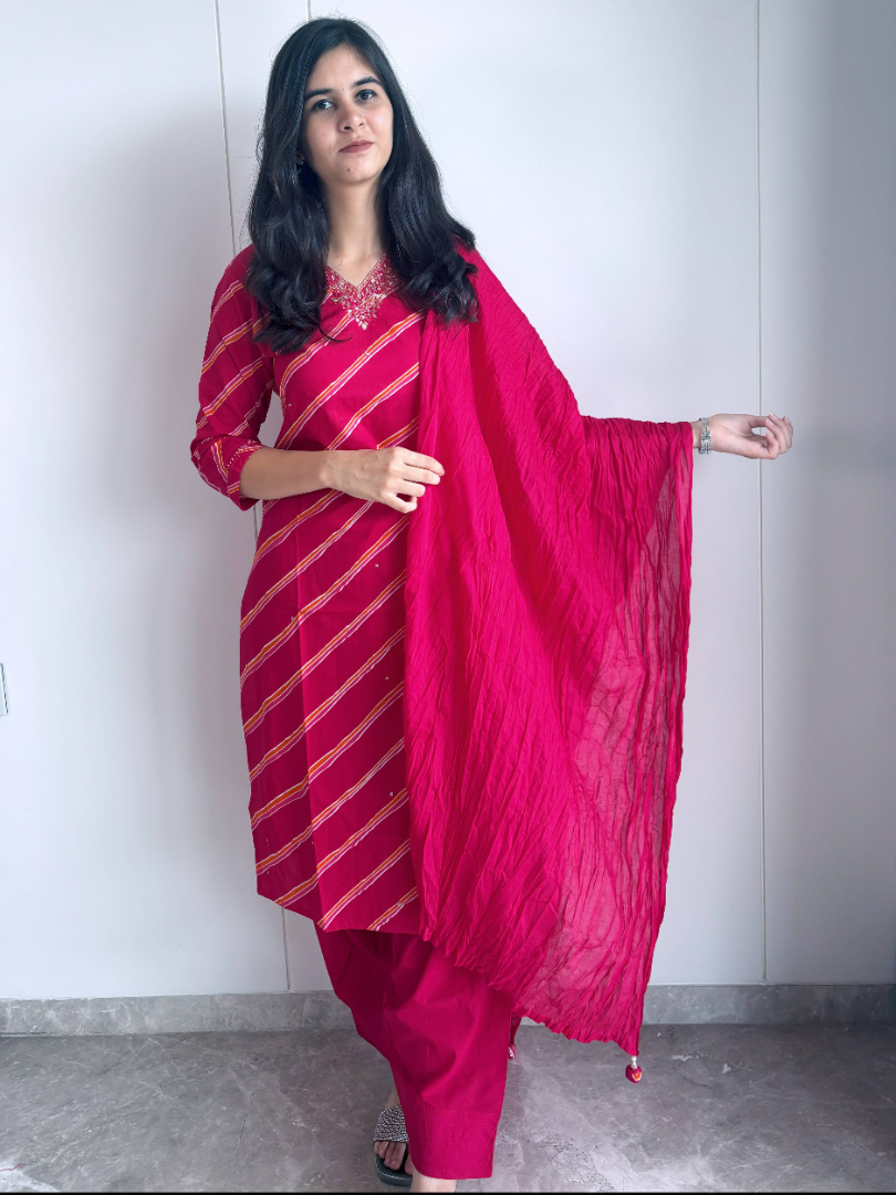 Simple, classy, and super comfortable – this Cotton Leheriya Suit is your go-to outfit for every occasion. Crafted from breathable cotton, it ensures all-day comfort while keeping you effortlessly stylish. The timeless leheriya pattern adds a touch of tradition, making it perfect for casual day outs, office wear, or small gatherings. A versatile addition to your wardrobe, it combines elegance with ease for the modern woman.